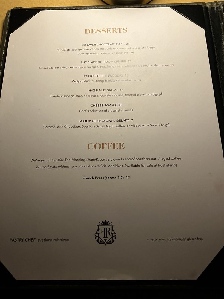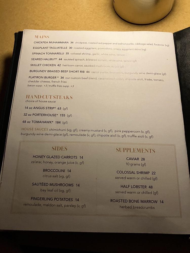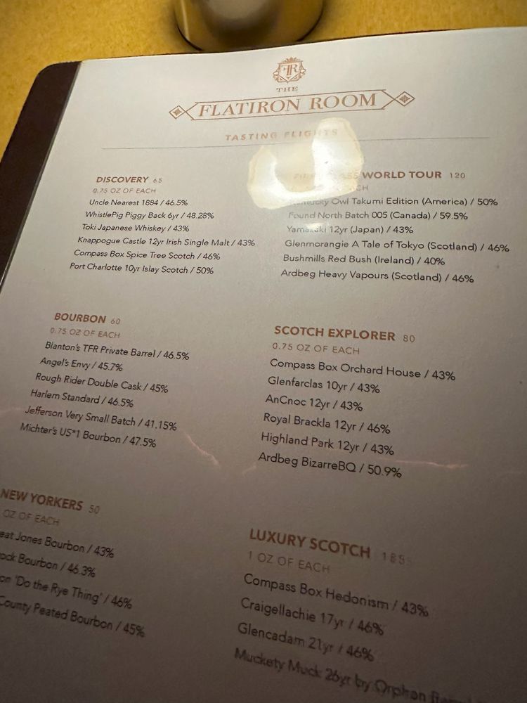 “ The Flatiron Room is simply an amazing restaurant. Went there for my birthday with a group of friends. Everything from the staff, to the music, and food. Excellent restaurant. The vibe right off the bat was great and we were greeted by the friendly host. My entire party of 7 was waited on quickly and no falters in orders at all. All drinks and food went to the correct people and our waitress didn't even write down the orders! For my entire group I paid around 1.2k but we all ordered appetizers, drinks, and entrees. Would 100% recommend for special occasions. ”